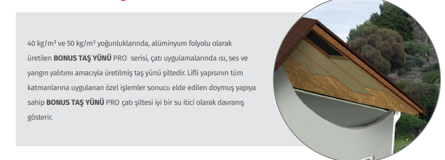 40 kg/m³ ve 50 kg/m³ yoğunluklarında, alüminyum folyolu olarak üretilen BONUS TAŞ YÜNÜ PRO serisi, çatı uygulamalarında ısı, ses ve yangın yalıtımı amacıyla üretilmiş taş yünü şiltedir. Lifli yapısının tüm katmanlarına uygulanan özel işlemler sonucu elde edilen doymuş yapıya sahip BONUS TAŞ YÜNÜ PRO çatı şiltesi iyi bir su itici olarak davranış gösterir