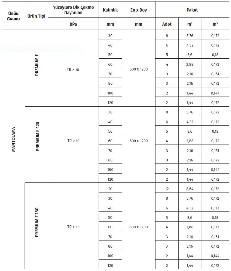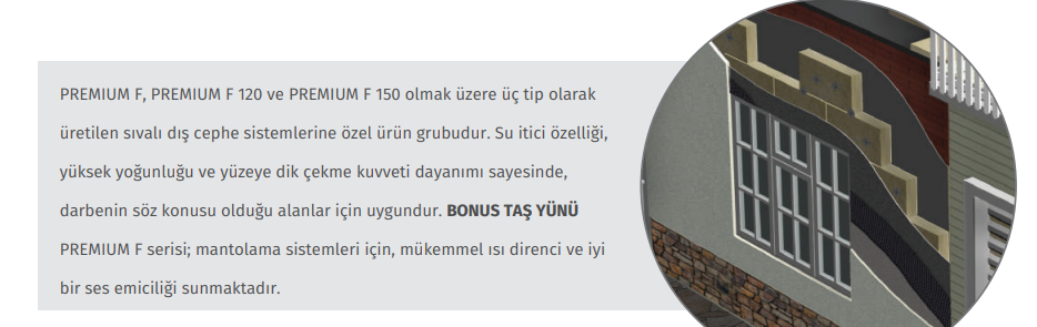 PREMIUM F, PREMIUM F 120 ve PREMIUM F 150 olmak üzere üç tip olarak üretilen sıvalı dış cephe sistemlerine özel ürün grubudur. Su itici özelliği, yüksek yoğunluğu ve yüzeye dik çekme kuvveti dayanımı sayesinde, darbenin söz konusu olduğu alanlar için uygundur. BONUS TAŞ YÜNÜ PREMIUM F serisi; mantolama sistemleri için, mükemmel ısı direnci ve iyi bir ses emiciliği sunmaktadır.