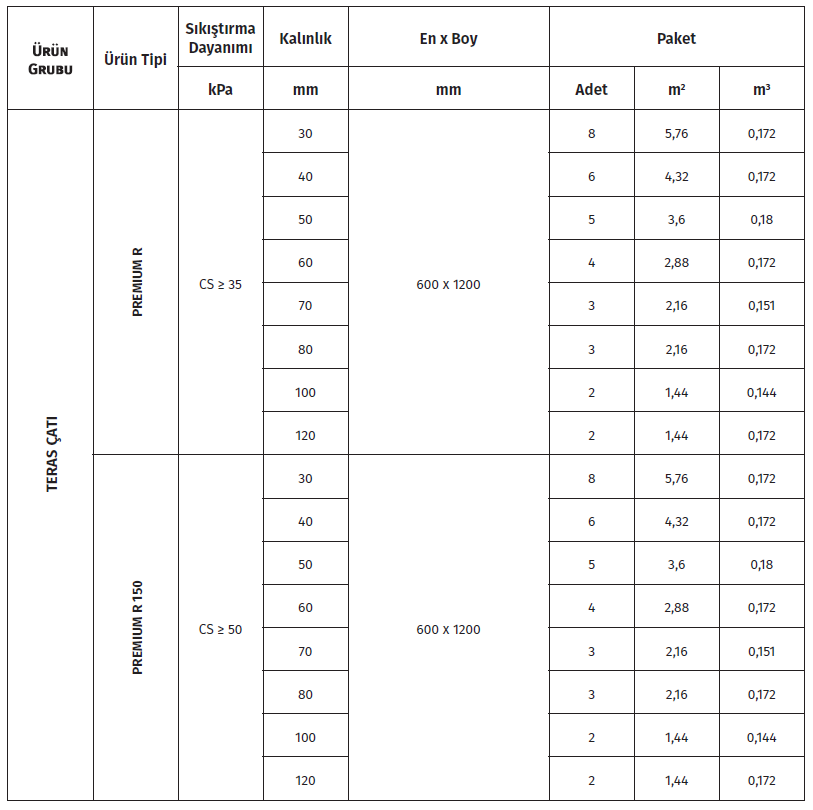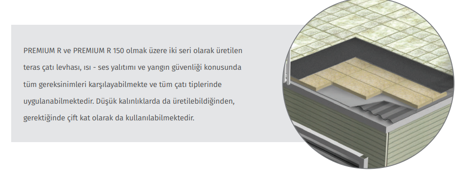 PREMIUM R ve PREMIUM R 150 olmak üzere iki seri olarak üretilen teras çatı levhası, ısı - ses yalıtımı ve yangın güvenliği konusunda tüm gereksinimleri karşılayabilmekte ve tüm çatı tiplerinde uygulanabilmektedir. Düşük kalınlıklarda da üretilebildiğinden, gerektiğinde çift kat olarak da kullanılabilmektedir.